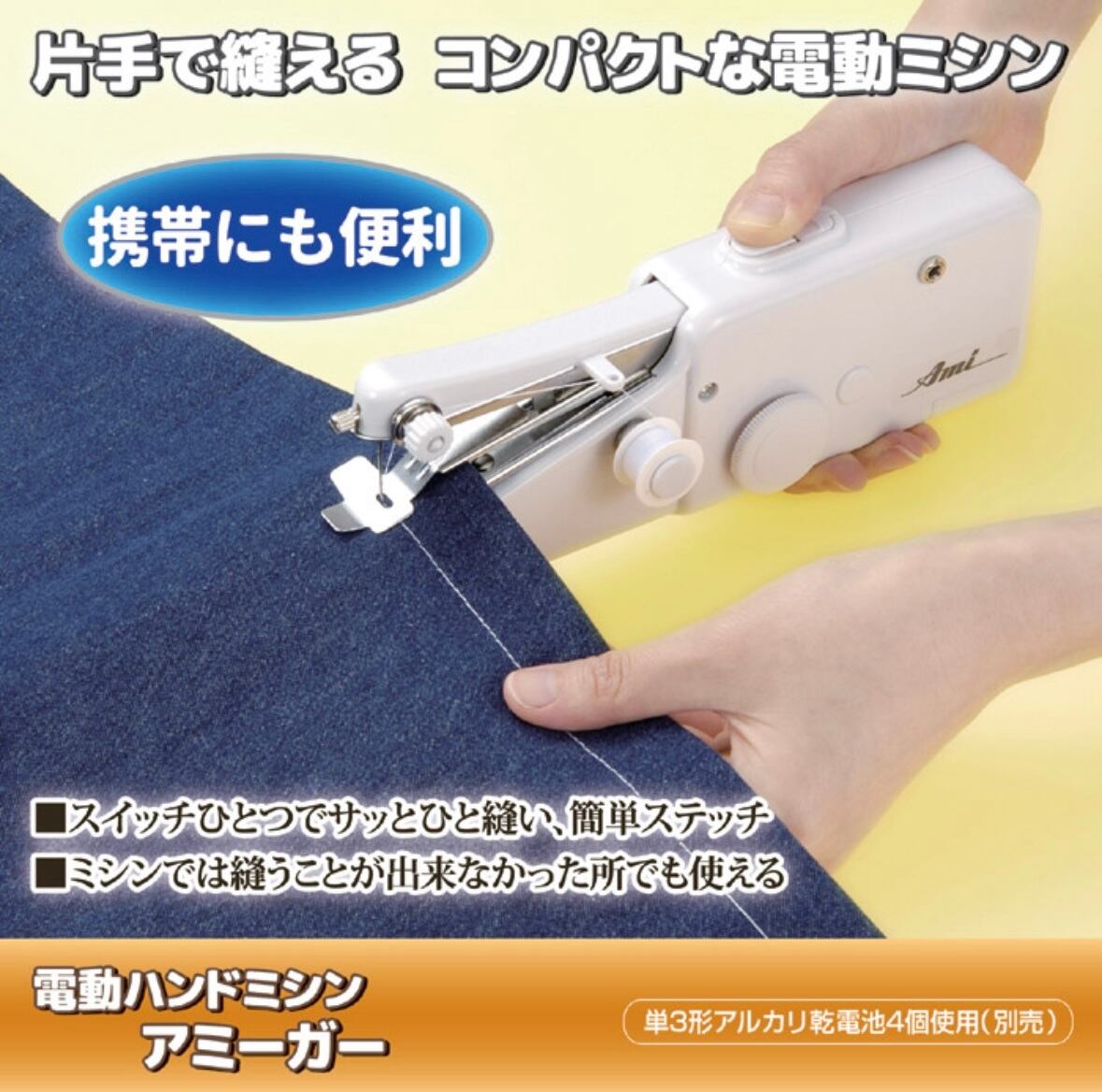 軽量、コンパクトな手で持って使える電動ミシンです。「ちょっとココを縫いたい」と思ったらスイッチひとつでサッとひと縫い、簡単ステッチが可能です。軽いので持ち運びができるのも便利なところ。便利な安全スイッチストッパー付き。