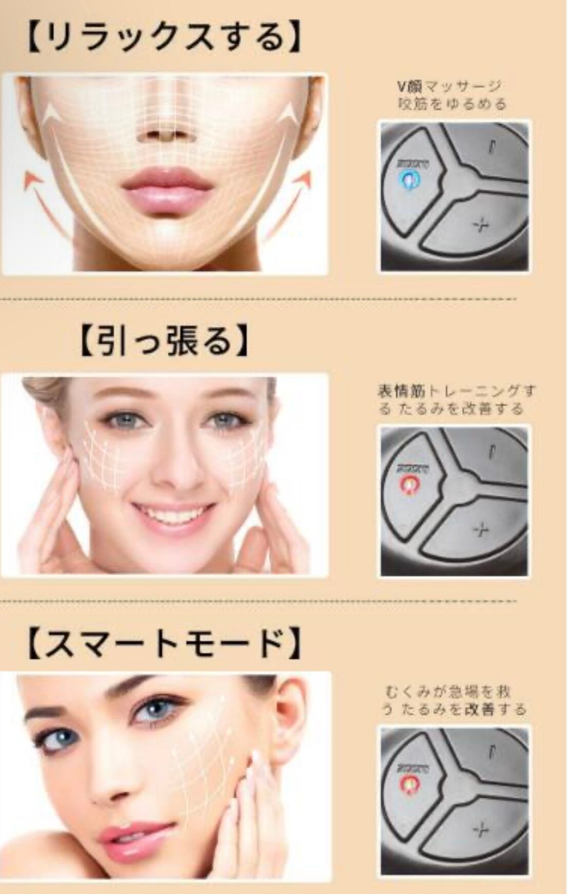 リラックスモード:リラックスする咬筋、V顔マッサージ;アップモード:ems微電流技術によりひっぱり締める,しわ防止、垂れ防止,スマートモード(総合モード):むくみ応急、引き締めしわ;ご注意:スマートモード時のみ振動します。リラックスモードとリフトアップモードでは振動しません。リラックスモードとリフトアップモードはEMS微電流原理を導入して、筋肉を刺激し、自動的に筋肉の収縮運動を行います。
